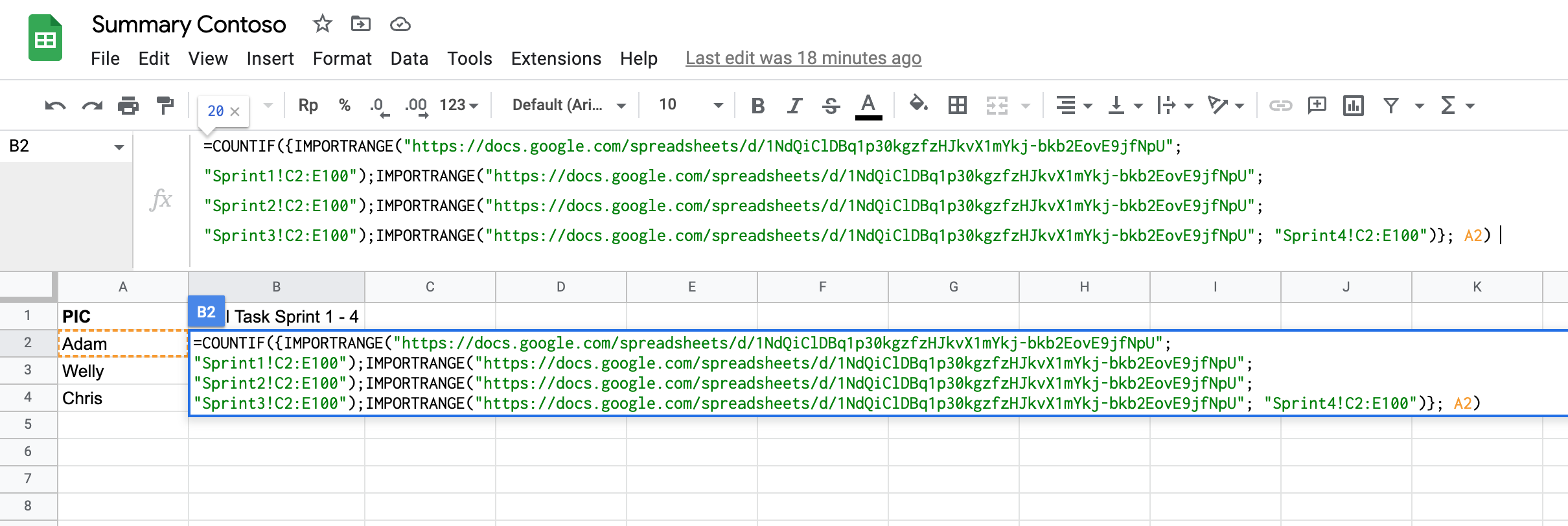 Edit cell value in column B2 with formula =COUNTIF({IMPORTRANGE("DOC_URL"; "Sprint1!C2:E100");IMPORTRANGE("DOC_URL"; "Sprint2!C2:E100");IMPORTRANGE("DOC_URL"; "Sprint3!C2:E100");IMPORTRANGE("DOC_URL"; "Sprint4!C2:E100")}; A2) , and replace DOC_URL with your spreadsheet URL. This formula uses {} as an array to collect the range of Sprint 1 - 4 as data ranges.