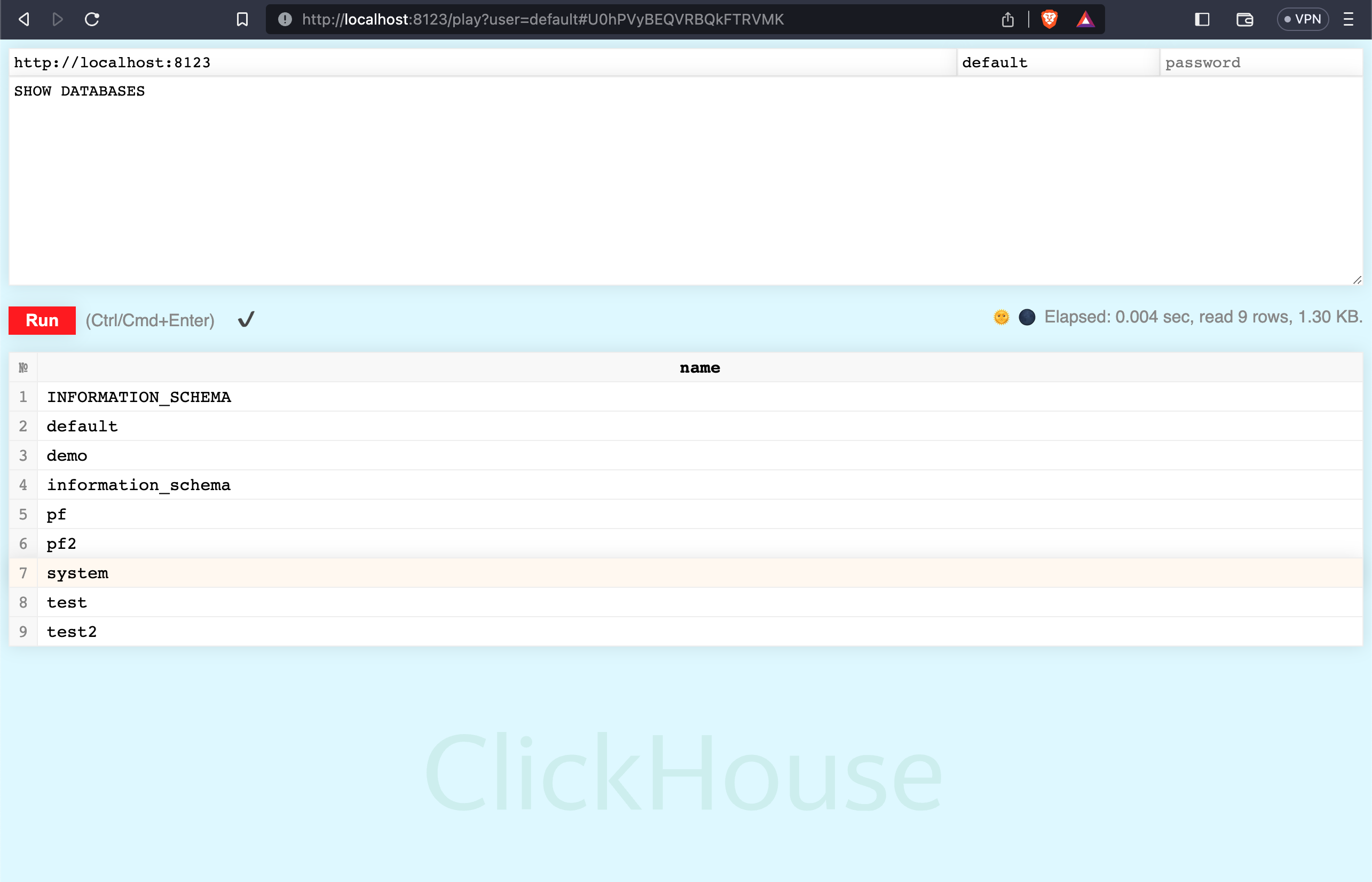 The ClickHouse server listens for HTTP clients on port 8123 by default. There is a built-in UI for running SQL queries at http://127.0.0.1:8123/play (change the hostname accordingly).
