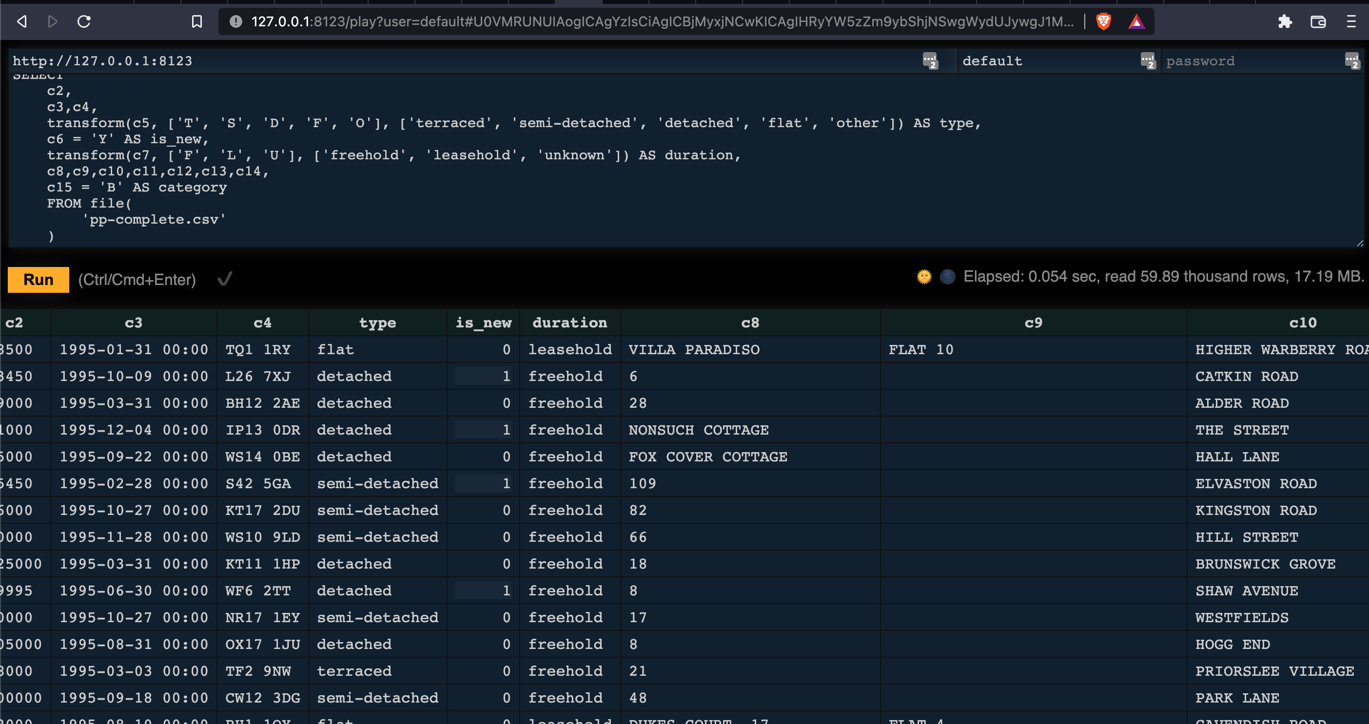 ) ENGINE = MergeTree ORDER BY ( postcode , addr1 , addr2 );
